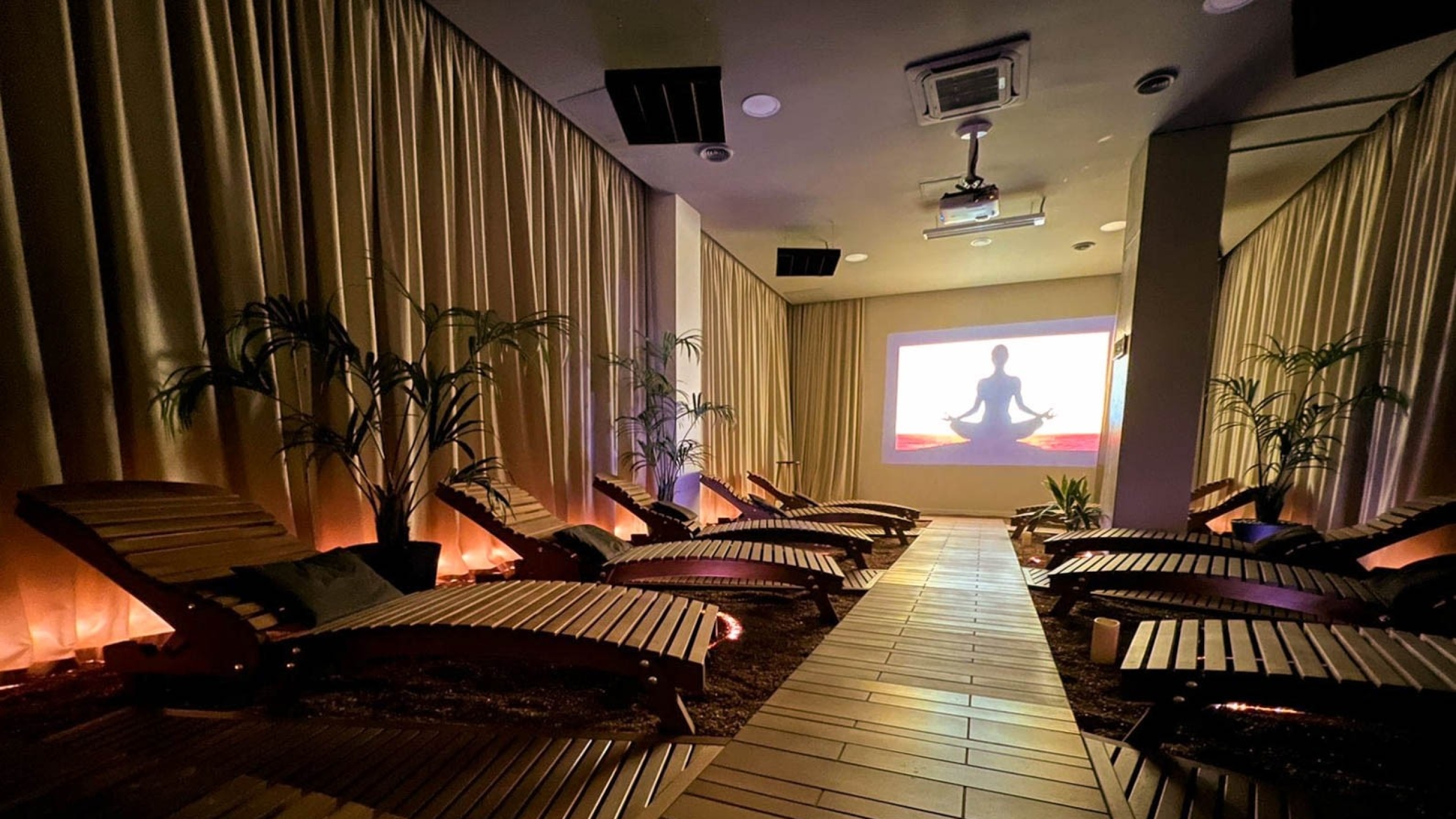 Янтарная комната— зал для практик с температурой 33-34С, где проходят дыхательные практики и практики самомассажа, а также ауди-медитации.